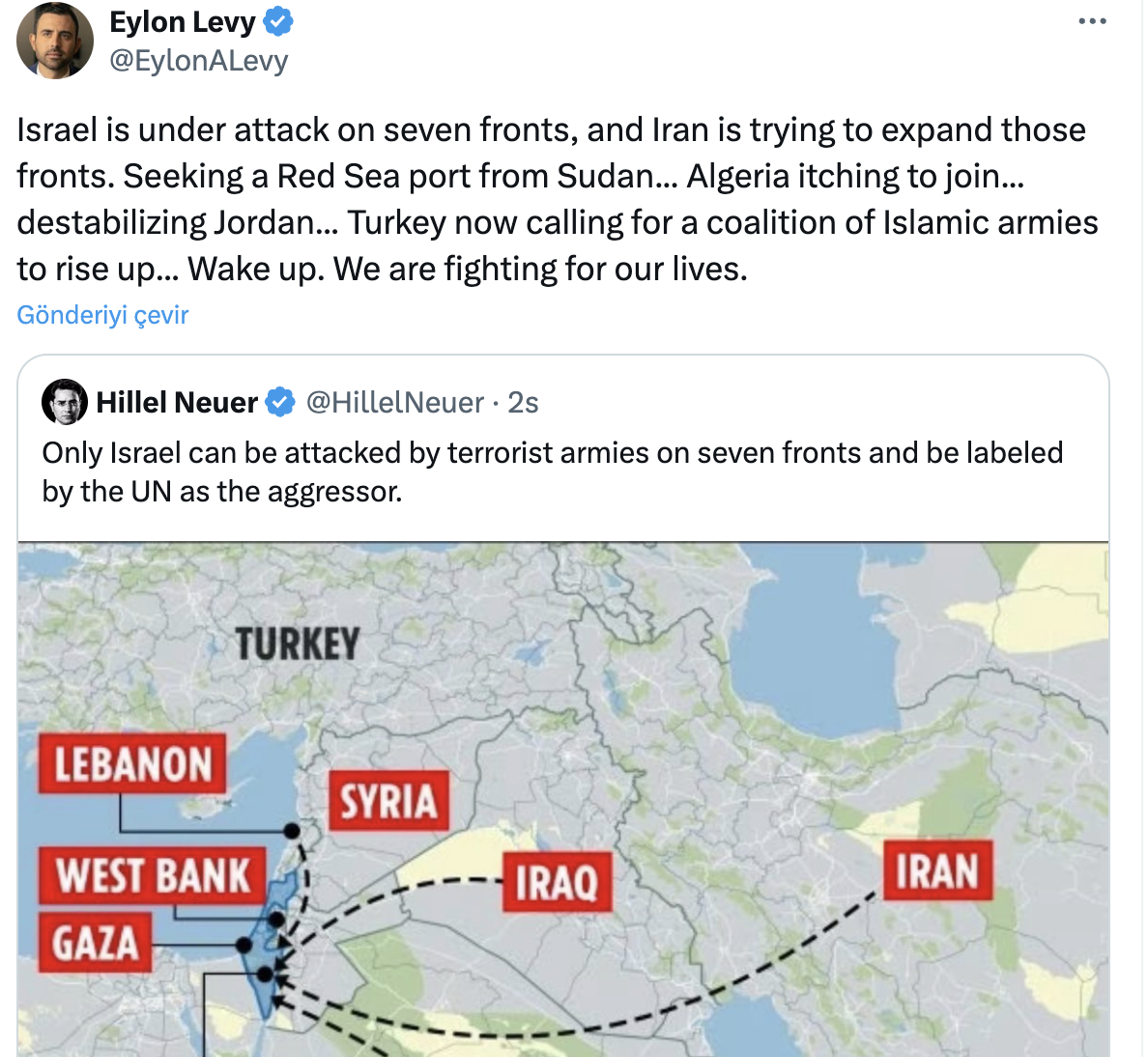 Buna karşılık eski İsrail hükümet sözcüsü Eylon Levy de Cumhurbaşkanı Erdoğan’ın Gazze için Müslüman ülkelere çağrıda bulunacağına dair sözlerini hatırlatarak İsraillilere şu sözlerle seslendi ‘İsrail yedi cepheden saldırı altında. Şimdi de Türkiye İslam ordularını İsrail’e karşı toplamak istiyor. Uyanın, kalkın hayatımız için savaşıyoruz’